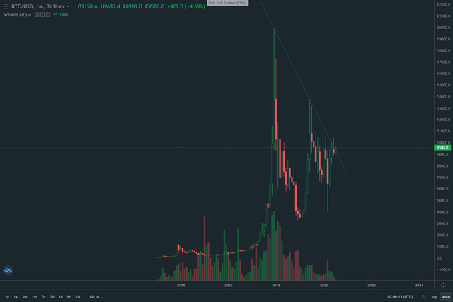 ビットコインの月足チャートがこちらになります。まだ確定していないですが少し抜け始めています。。。